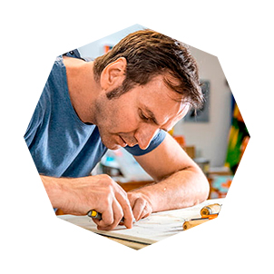 Roman Klonek, born in Kattowitz/Poland, has a spot for old fashioned cartoons and modern block printing styles. In the 90s he studied Graphic Arts in Duesseldorf and discovered a passion for woodcut. For the past 20 years he has created illustrations and prints with a wide range of whimsical creatures, mostly half animal/half human and preferably in awkward situations. His work can be described as a bizarre balancing act between propaganda, folklore and pop. He works together with friends in a studio in Düsseldorf, Germany.
