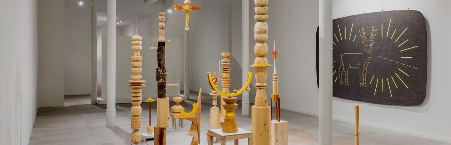 Ensamble de troncos, madera reciclada torneada y varillas de cobre