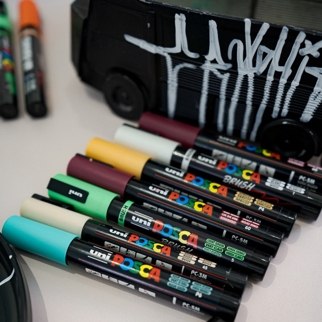 La elección de POSCA como herramienta para esta intervención colectiva no es casual. Su facilidad de uso, control del trazo y compatibilidad con múltiples superficies garantizan una experiencia accesible sin comprometer la potencia visual del resultado. El marcador funciona de esta forma, como mediador entre el ámbito profesional y la experimentación espontánea, borrando las jerarquías técnicas.