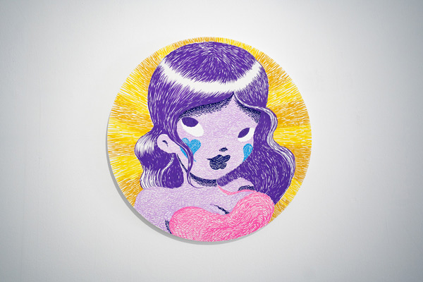 La intensidad cromática propia del marcador dialoga con la contundencia formal del círculo, generando superficies donde la saturación y el contraste adquieren protagonismo. La herramienta se integra así en el discurso expositivo, siendo un elemento coherente con las estéticas de los artistas participantes